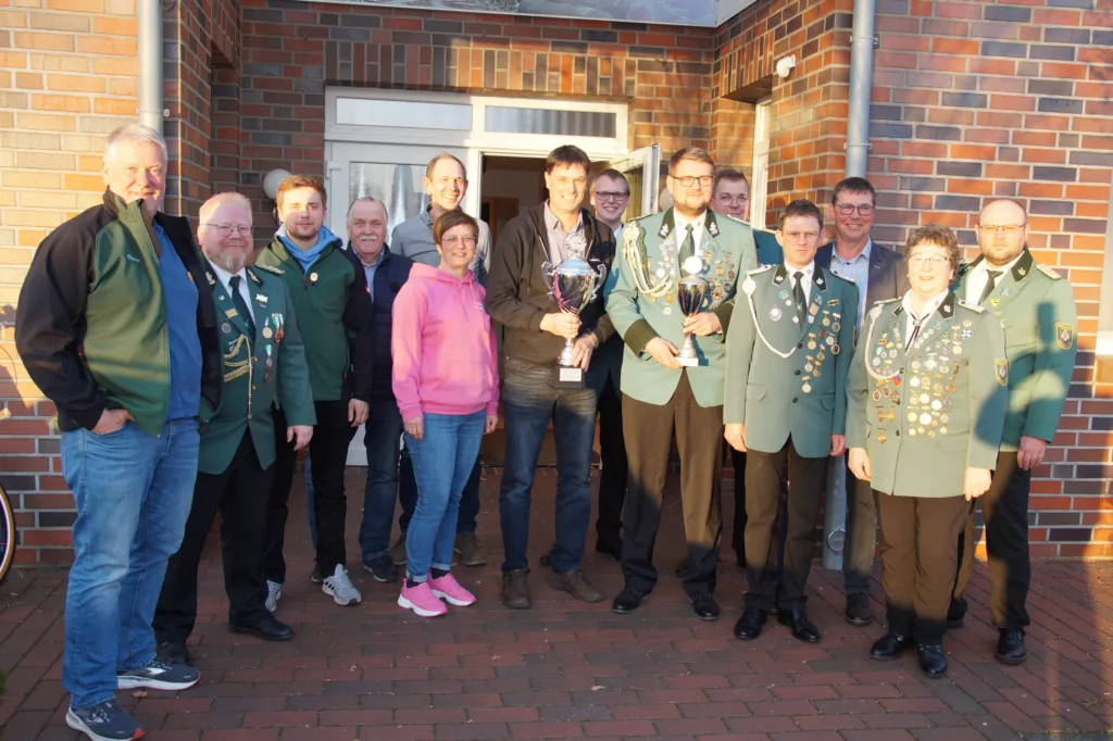 Da Bürgermeister Thomas Otto verhindert war, übernahm Saterlands stellvertretender Bürgermeister Rainer Fugel die Vertretung der Gemeinde und führte gemeinsam mit Rudolf Mai, dem 1. Vorsitzenden des Schützenvereins Neuscharrel, die Pokalverleihung durch.